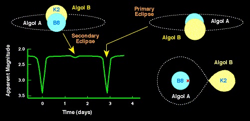 Algol on pimennysmuuttuja. Tässä kaksoistähtijärjestelmässä Algol A ja Algol B kiertävät yhteisen massakeskipisteen ympäri 2.867 päivässä. Yksi kierros kestää siis 2 päivää, 20 tuntia ja 49 minuuttia. Algol A on paljon kirkkaampi kuin Algol B. Algol B on säteeltään suurempi kuin Algol A. Näemme tämän kaksoistähtijärjestelmän lähes sen ratatason suunnasta, joten tähdet pimentävät vuorotellen toisiaan. Primääripimennyksessä himmeämpi Algol B peittää osittain kirkkaamman Algol A:n. Tämän primääripimennyksen voi havaita paljain silmin. Sekundääripimennyksessä kirkkaampi Algol A peittää osittain himmeämmän Algol B:n. Tätä sekundääripimennystä ei voi havaita paljain silmin. Kuvassa alla näkyy Algolin valokäyrä, sekä molempien pimennysten paikat tällä valokäyrällä. Oikeassa alakulmassa on lisäksi kuva siitä, miltä järjestelmä näyttäisi ylhäältä päin, jos olisi mahdollista katsoa sitä ratatason suhteen kohtisuorasta suunnasta (kuva: @freestarcharts.com)
