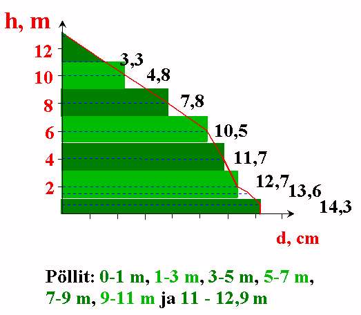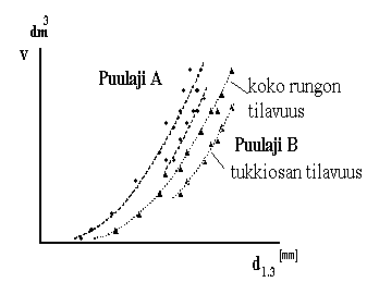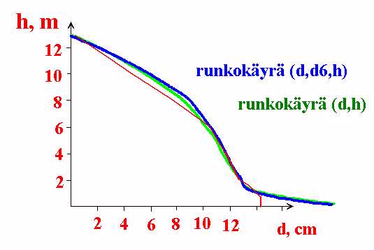 Yhden läpimitan yhtälö aliarvioi tilavuuden, koska kyseessä on puu, jolla on keskimääräistä "parempi" muoto.