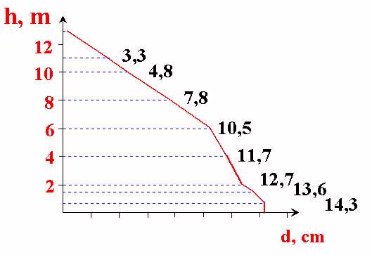 v = f(d,d6,h) kun d=13,6 cm, d6=10.5 cm ja h=12.9 m