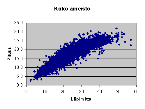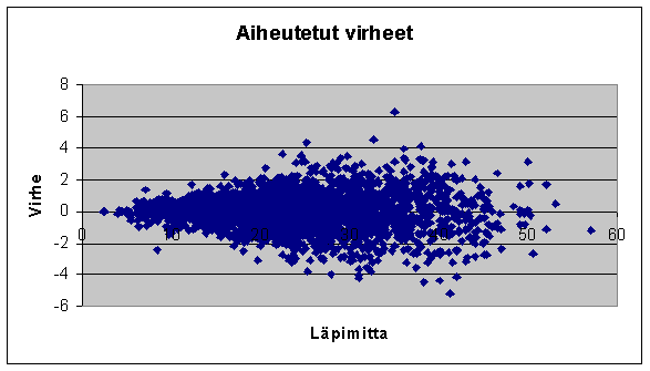 Aineistosta estimoitiin (luokittain) läpimitan suhteen seuraava likimääräinen varianssi yli pituuskäyrän (Kuusi 03). sqrt(var) = 4 * d. Eli esim. 30 cm:n kohdalla hajonta olisi likimain 1.2 metriä (käyrän estimointi perustui oletukseen homogeenisesta varianssista). Käänteisfunktiomenetelmällä laskettiin pituudet lukupuille: