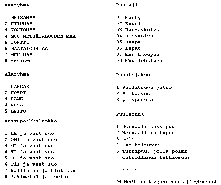 Koodit muuttujille Pääryhmä, Alaryhmä, Kasvupaikkaluokka,