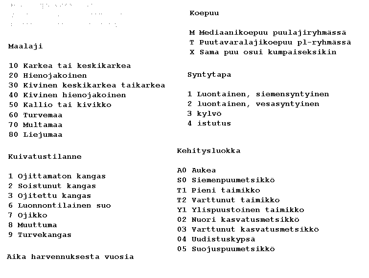 Koodit muuttujille Maalaji, Kuivatustilanne, Koepuu, Syntytapa,