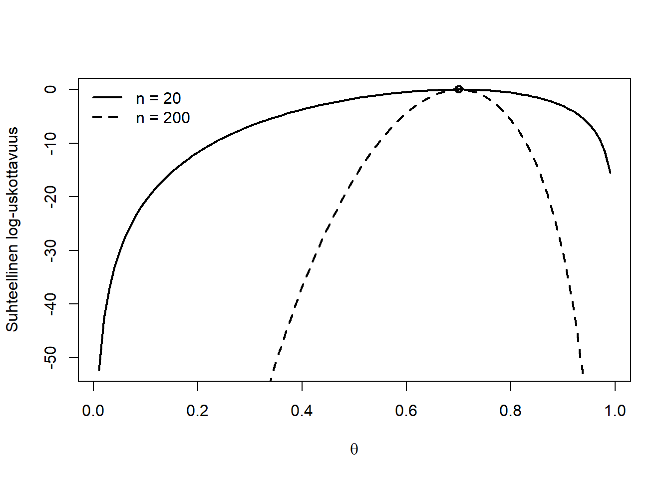 Yllä näimme kuinka suurimman uskottavuuden estimaattori löytyi log-uskottavuusfunktion nollakohdasta. Merkitään nyt log-uskottavuusfunktiota lyhyesti \(\ell(\theta) := \ell(\theta; Y) := \log f(Y|\theta)\) ja havaitulle aineistolle \(\ell(\theta; y)\). On mielenkiintoista verrata binomijakauman log-uskottavuusfunktioiden muotoa suurimmin uskottavuudeen pisteen ympärillä, kun otoskoko muuttuu. Alla oleva kuva piirtää kuvaajan \(\theta \mapsto \ell(\theta) - \ell(\hat{\theta})\), kun otoskoko kasvaa kahdesta kymmenestä (katkoton viiva) kahteen sataan (katkoviiva) ja suurimman uskottavuuden estimaatti \(k/n\) (pallo) pysyy vakiona. Siinä missä suurimman uskottavuuden arvo pysyy paikallaan x-akselilla yli otoskokojen, log-uskottavuusfunktion kaarevuus tuon pisteen ympärillä muuttuu suuresti, jyrkentyen otoskoon kasvaessa. Jos ehto \(\ell'(\hat{\theta}) = 0\) määrittää suurimman uskottavuuden estimaatin, niin funktion vahvempi kaareutuminen pisteen \(\ell(\hat{\theta})\) ympärillä implikoi suurempaa varmuutta, että juuri \(\hat{\theta}\) todella on funktion \(\ell'\) nollakohta, jonkin toisen likeisen \(\theta\)-akselin pisteen sijaan. Funktion \(\ell\) kaareutumiseen määrää pisteessä \(\hat{\theta}\) mittaa sen toinen derivaatta ko. pisteessä, eli \(\ell''(\hat{\theta})\). Sitä negatiivisempi on \(\ell''(\hat{\theta})\) mitä jyrkemmin \(\ell\) putoaa lakipisteensä \(\hat{\theta}\) ympärillä.