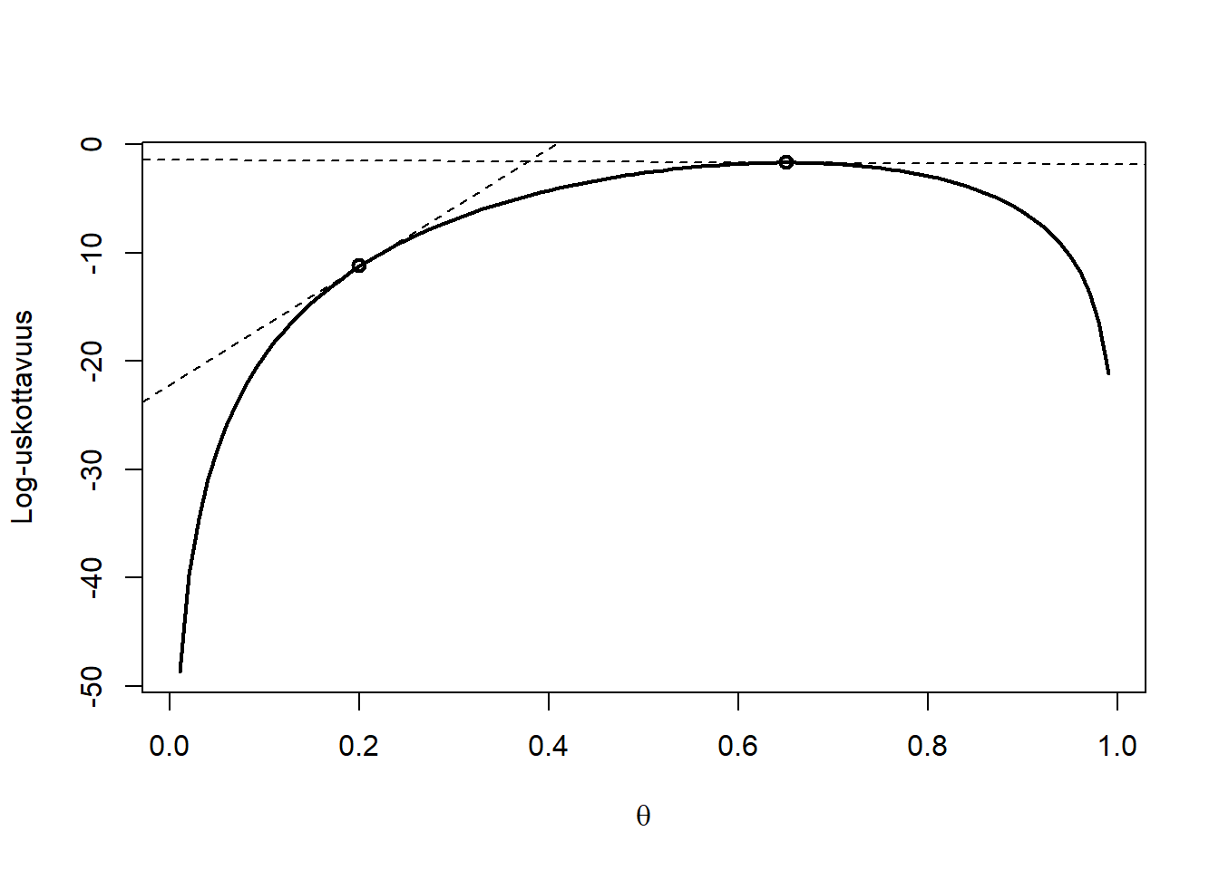 k <-sum(y) # lasketaan tyhjentava tunnusluku# log-uskottavuusfunktio:logf <-function(theta) log(dbinom(k, size=n, prob=theta))# kuvaaja:theta_vals <-seq(0.01, 0.99, by=0.01)plot(theta_vals, logf(theta_vals), type ="l", lwd =2,xlab =expression(theta), ylab ="Log-uskottavuus")# derivaatatds <-diff(logf(theta_vals))/0.01; sue =round(k/n*100)abline(a=logf(theta_vals[20])-ds[20]*theta_vals[20],b=ds[20], lty =2)abline(a=logf(theta_vals[sue])-ds[sue]*theta_vals[sue],b=ds[sue], lty =2)points(theta_vals[c(20,sue)], logf(theta_vals[c(20,sue)]), lwd =2)